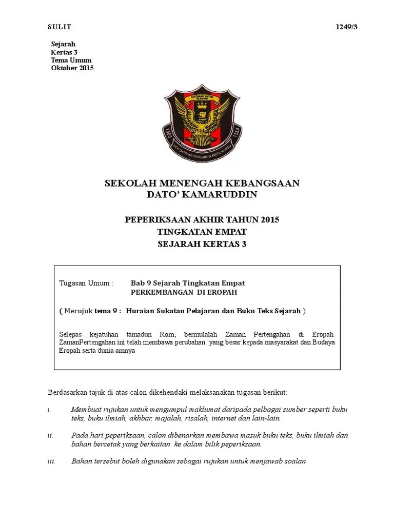 Pihak lembaga peperiksaan malaysia (lp) akan memaklumkan tema umum atau tajuk soalan bagi sejarah kertas 3 spm 2020 di portal rasmi lp. Pembinaan negara dan bangsa ke arah kemunculan negara malaysia berdaulat. Malaysia merupakan sebuah negara yang mengamalkan sistem demokrasi berasaskan kepada sistem persekutuan. Tema umum sejarah kertas 3 spmu 2020 tema umum sejarah kertas 3 sijil pelajaran malaysia ulangan (spmu) jun 2020. Berikut adalah tajuk atau tema umum soalan bagi mata pelajaran sejarah kertas 3 (1249/3) untuk untuk calon persendirian bagi peperiksaan spmu 2020 sepertimana yang diumumkan oleh lembaga peperiksaan, kementerian pendidikan malaysia. Tema umum sejarah kertas 3 spm 2020 (kertas 1249/3) telahpun diumumkan secara rasmi. Senarai tema umum sejarah kertas 3 spm/ spmu tahun lepas spmu tahun 2016 : Perkembangan di eropah dan kesannya terhadap ekonomi negara. Sebelum kedatangan penjajah british, masyarakat peribumi di tanah melayu, sarawak dan sabah menjalankan kegiatan ekonomi yang tersendiri. Tahun 2019 ianya adalah pembinaan negara dan bangsa ke arah kemunculan negara malaysia berdaulat yang nerupakan tajuk yang sama untuk tahun 2018. Pembinaan negara dan bangsa ke arah kemunculan negara malaysia berdaulat. Tema umum sejarah kertas 3 spm 2020 (kertas 1249/3) akan dikeluarkan. Aug 12, 2021 · tema umum sejarah kertas 3 spm ulangan (u) 2015.